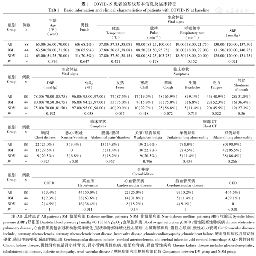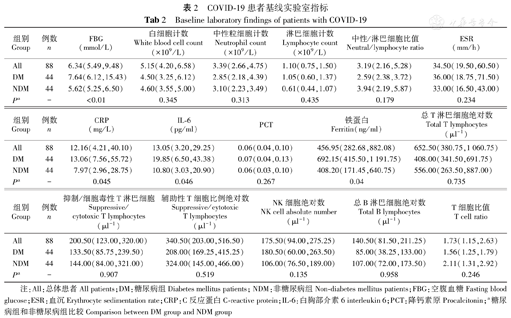 本研究共纳入COVID-19患者88例,其中男性60例(68.2%),中位年龄为65岁(56~70岁),糖尿病组和非糖尿病组患者各44例。两组之间的年龄、性别相匹配(表1)。