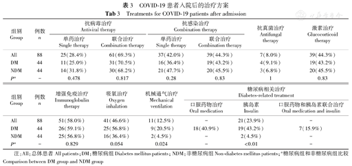 糖尿病组和非糖尿病组在抗病毒治疗、抗微生物治疗、激素治疗、增强免疫治疗和氧疗等方面无显著差异。不同的是,糖尿病组有更多的患者需要机械通气(表3)。