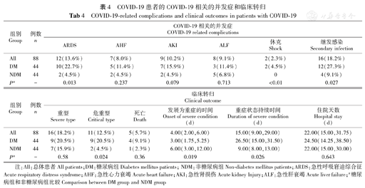 入院后患者出现多种与COVID-19相关的并发症,如:继发感染(18.2%)、ARDS(13.6%)和急性肾损伤(10.2%)。糖尿病组出现继发感染和ARDS的比例明显高于非糖尿病组,所有患者中有2例出现休克,均为2型糖尿病患者(表4)。