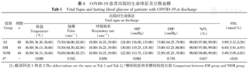 出院时糖尿病组与非糖尿病组生命体征无明显差异。出院时患者空腹血糖均控制在目标范围内,糖尿病组出院时血糖为6.44(5.91, 6.93)mmol/L,非糖尿病组出院时血糖为5.49(5.09,6.03)mmol/L。比较两组,糖尿病组空腹血糖明显高于非糖尿病组(表6)。