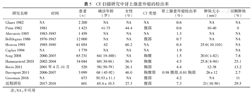 20世纪80至90年代CT研究队列中肾上腺意外瘤的检出率为0.35%~1.9%。2006年,在520名自愿接受CT筛查的肺癌高危患者中,肾上腺意外瘤的检出率为4.4%,而最近的一些研究提示这一比例大约为5%。这种更高的检出率很可能是由于CT成像分辨率提高所致。