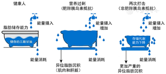 注:健康人群其脂肪储存能力正常,能量摄入正常且与能量消耗大致平衡,三酰甘油的存储没有超过脂肪的储存能力,因此不会发生异位脂肪沉积,也不会有显著的胰岛素抵抗。在没有经历生命早期营养不良但经历成年营养过剩的人群中,其脂肪储存能力正常,能量摄入增加且超过能量消耗,导致三酰甘油的存储超过脂肪储存能力,导致异位脂肪沉积,最终导致肥胖胰岛素抵抗。在经历生命早期营养不良和成年营养过剩(两次打击)的人群中,其脂肪储存代谢能力下降,能量摄入增加且超过能量消耗,导致更严重的异位脂肪沉积,造成非肥胖性胰岛素抵抗,通常表现是BMI较低而内脏肥胖严重
