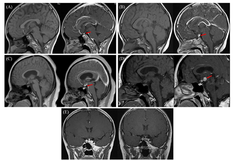 注:(A)病例1(初诊时),垂体柄上部局限性增粗,增强后明显强化,垂体后叶高信号未见显示;(B)病例2(初诊时),垂体柄增粗并结节状强化明显,垂体后叶高信号未见显示;(C)病例3(初诊时),垂体柄根部及第三脑室周围病变,增强后明显强化,垂体后叶高信号未见显示;(D)病例3(9个月后复诊时),垂体柄根部及第三脑室周围病变,范围较前扩大,垂体后叶高信号可见;(E)病例1治疗前、治疗1年后,垂体柄增粗较前缓解