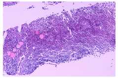 病例3:患者女性,30岁。2017年10月出现口渴、多饮、多尿,日饮水量5~6 L,尿量约5 L,夜尿3~4次,伴乏力、月经周期延长、月经量减少,无头痛、视物模糊、视野缺损,食欲正常,体重半年增加10 kg。患者20岁、22岁时分别行剖腹产分娩1子1女。入院后查血常规、肝功能、肾功能、血电解质无异常。血渗透压321 mmol/L(275~310 mmol/L)、尿渗透压150 mmol/L、尿比重1.005。甲状腺功能:FT34.88 pmol/L、FT46.25 pmol/L、TSH 0.47 μIU/mL。PTH:25.41 pg/mL。ACTH-皮质醇节律示ACTH水平8:00为30.5 pg/mL、16:00为28.0 pg/mL,皮质醇水平8:00为4.47 μg/dL、16:00为2.85 μg/dL,24 h尿(尿量5.2 L)游离皮质醇水平73 nmol/d(73~372 nmol/d)。生长激素<0.05 ng/mL,IGF-1水平199.1 ng/mL。性激素六项:卵泡刺激素(FSH)2.6 mIU/mL(3.03~8.08 mIU/mL)、促黄体生成素(LH)0.13 mIU/mL(2.39~6.60 mIU/mL)、雌二醇11.0 pg/mL(21~251 pg/mL)、孕酮<0.1 ng/mL(<0.1~0.3 ng/mL)、睾酮<0.13 ng/mL(0.11~0.57 ng/mL)。催乳素143.22 ng/mL;血β绒毛膜促性腺激素<0.1 mIU/mL。行禁饮加压素试验(+)。垂体MRI(图1C):垂体柄漏斗部及三脑室周围病变,增强后明显强化,考虑LCH、炎症性疾病、结节病;垂体后叶高信号未见显示。彩超:甲状腺未见异常,浅表淋巴结未见异常肿大,肝脏和脾脏无异常。肺部CT:未见异常。腰椎穿刺术失败,未能检测脑脊液β绒毛膜促性腺激素水平和病理细胞。建议患者行鞍区病变活检术,患者拒绝,给予糖皮质激素、左甲状腺素钠片(优甲乐)、醋酸去氨加压素片(弥凝片)替代治疗后出院。2018年6月至外院就诊,诊断为"垂体炎",予以甲泼尼龙(12 mg/d)口服,后调整为泼尼松(20 mg/d),症状无改善,渐出现继发性闭经。2019年1月至本院复查垂体MRI(图1D):垂体柄漏斗部及三脑室周围病变,范围较2018年4月扩大,垂体后叶高信号未见显示。2019年4月至外院行脑立体定位活组织检查术,病理示LCH,免疫组化S-100()、Langerin()、CD1a()、CD68(+)、催乳素(-)、Ki-67指数约10%。