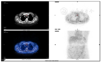 入院后完善相关检查,尿常规、粪常规、肝功能常规、免疫六项、类风湿全套、自身抗体谱、自免肝抗体谱、感染性疾病筛查、肿瘤标志物、心肌酶谱、心肌标志物、凝血功能、尿轻链、血轻链、免疫电泳、蛋白电泳未见异常。HbA1C 6.7%(T2DM人群:<7%);口服葡萄糖耐量试验:空腹血糖3.62 mmol/L(T2DM人群:4.4~7.0 mmol/L),餐后2 h血糖8.88 mmol/L(T2DM人群:<10.0 mmol/L),空腹胰岛素94.21 pmol/L(正常参考范围17.8~173,下同),餐后2 h胰岛素456.6 pmol/L,空腹C肽1.73 nmol/L(0.37~1.47),餐后2 h C肽3.32 nmol/L;白蛋白39 g/L(35.0~52.0);血脂:总胆固醇6.06 μmol/L(T2DM人群:<4.5 μmol/L),三酰甘油4.43 μmol/L(T2DM人群:<1.7 μmol/L),高密度脂蛋白胆固醇0.65 μmol/L(T2DM人群:>1.0 μmol/L),低密度脂蛋白胆固醇3.6 μmol/L(T2DM人群/未合并动脉粥样硬化性心血管疾病:<2.6 μmol/L);肾功能:血尿酸816 μmol/L(143~420),血尿素:14.6 mmol/L(2.78~8.07),血肌酐212 μmol/L(45~104),eGFR(CDK-EPI) 27 mL·min-1·(1.73 m2)-1(>90),β2微球蛋白8.08 mg/L(0.7~1.8),尿肌酐4 940 μmol/L,尿微量白蛋白/肌酐33 mg/g(<20);骨代谢:25羟维生素D 54.05 nmol/L(>=75),骨钙素N端中分子片段223.2 ng/mL(14~46),β-胶原降解产物2 812 pg/mL(43~783),血清骨型碱性磷酸酶125 U/L(<=100),降钙素<2 pg/mL(0~8.4)。提示患者有高脂血症,高尿酸血症,2型糖尿病并肾病,慢性肾脏病Ⅳ期。进一步完善双肾及肾血管超声提示左肾大小59 cm×122 cm,肾实质厚20 mm,右肾大小47 cm×81 mm,肾实质厚12 mm,双侧肾动脉血流部分阻力指数增高,右肾皮质变薄、皮髓质分界不清。同时,患者血PTH升高、高钙血症、低磷血症(表1)、血氯/磷比值升高、尿钙正常、血清骨型碱性磷酸酶轻度升高、骨钙素N端分子片段、β-胶原裂解产物升高提示骨代谢异常,临床高度怀疑甲状旁腺功能亢进,进一步行甲状旁腺超声未见明显占位。胸部CT平扫提示两肺多发结节,前纵隔软组织影(大小约17 mm×29 mm,边界清)。骨密度检查显示左髋部骨量减少,T值=-1.9。