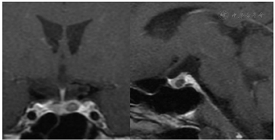 其他垂体前叶功能评估方面,生长激素0.2 ng/mL,胰岛素样生长因子Ⅰ(IGF-Ⅰ) 239 ng/mL。孕酮1.16 ng/mL,睾酮1.59 ng/mL,催乳素21.8 ng/mL,卵泡刺激素5.02 IU/L,黄体生成素3.21 IU/L,雌二醇16 pg/mL,硫酸脱氢表雄酮678 μg/dL,游离甲状腺素1.14 ng/dL,促甲状腺素(TSH)0.770 μIU/mL,游离三碘甲状腺原氨酸2.29 pg/mL。考虑其他垂体前叶功能大致正常。