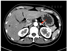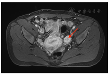 大多数NOS分泌激素,如雄激素、雌激素、皮质醇、醛固酮等[3],导致患者体内激素功能紊乱从而表现出相应的临床症状。55%~77%NOS分泌雄激素,此类患者常具有男性化特征,如多毛、痤疮、脱发、声音变粗、阴蒂肥大、闭经和不孕等[4]。大约6%~23%患者雌二醇分泌增多,表现为子宫内膜不规则出血和子宫内膜息肉,甚至一些患者还发展为子宫内膜癌[3,4]。也有患者出现皮质激素升高,如库欣综合征。还有少数患者可以表现为难治性高血压[5]、大量腹水及CA125升高[6]。NOS常呈单侧、实性肿块[4]且可以发生在各个年龄段[7]。本例患者为中老年女性,病灶为卵巢单侧实性肿块,以高雄激素血症为主要临床表现,具体表现为脱发、阴蒂肥大、痤疮等,符合文献报道。