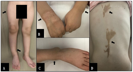 注:A:双下肢大体照片,箭头显示双下肢不等长,右下肢较左下肢短,右下肢弯曲畸形;B:双手手腕大体照片,箭头显示双侧手腕手镯征阳性;C:左脚脚踝大体照片,箭头显示脚镯征阳性;D:背部皮肤大体照片,箭头显示背部中线偏右处皮肤牛奶咖啡斑