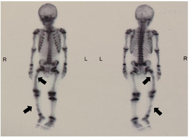 注:箭头示右侧股骨中段及右侧胫骨中下段放射性摄取增高区