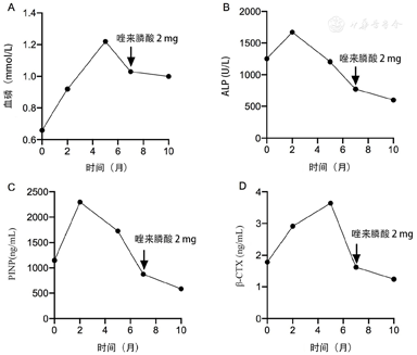 注:A:治疗前后血磷变化情况;B:治疗前后血ALP变化情况;C.治疗前后血PⅠNP变化情况;D:治疗前后血β-CTX变化情况;ALP:碱性磷酸酶;PⅠNP:Ⅰ型原胶原氨基端前肽;β-CTX:I型胶原羧基端肽