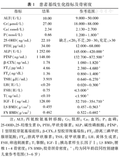 注:ALT:丙氨酸氨基转移酶;Cr:肌酐;Ca:血钙;P:血磷;25-OHD:25-羟维生素D; PTH:甲状旁腺素;ALP:碱性磷酸酶;PⅠNP:Ⅰ型原胶原氨基端前肽;β-CTX:I型胶原羧基端肽;FT3:游离三碘甲状腺原氨酸;FT4:游离甲状腺素;TSH:促甲状腺素;LH:黄体生成素;FSH:卵泡刺激素;T:睾酮;IGF-Ⅰ:胰岛素样生长因子Ⅰ;LS BMD:腰椎1~4骨密度;FN BMD:股骨颈骨密度;*:均为同年龄段同性别健康儿童参考范围(3~6岁)