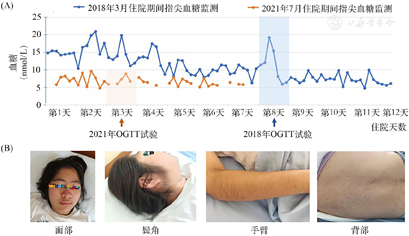 2021年7月(19岁)因"恶心、乏力1周"至本科就诊,门诊查空腹血糖20.0 mmol/L、尿糖(+++)、尿酮体(+),收住院。体格检查:血压、心率、呼吸正常,身高、体重大致同前;全身体毛明显增多(前额及后颈部发际线低、眉毛浓密、鬓角毛发增长旺盛),满月面容,面部痤疮、鼻头肥大呈酒渣样(图1B),月经量少,周期紊乱,其余体格检查未见异常。辅助检查:HbA1C 5.4%;OGTT结果见表1,计算稳态模型评估的胰岛素抵抗指数(HOMA-IR)为5.37、稳态模型评估的胰岛β细胞功能指数(HOMA-β)为244.34,住院期间指尖血糖监测见图1A;抗体检测:抗胰岛素抗体47.65 IU/mL(0~20.00 IU/mL),谷氨酸脱羧酶抗体及抗胰岛细胞抗体均阴性;三酰甘油2.90 mmol/L;尿比重1.009(1.010~1.025)、尿酸碱度6.0(5.5~7.5);皮质醇节律:16:00为114.50 ng/mL(32.40~150.00 ng/mL)、00:00为21.75 ng/mL(20.00~80.00 ng/mL)、8:00为167.60 ng/mL(72.60~322.80 ng/mL);促肾上腺皮质激素:16:00为3.72 pg/mL(3.00~30.00 pg/mL)、00:00为1.61 pg/mL(<20.00 pg/mL)、8:00为3.02 pg/mL(6.00~40.00 pg/mL);总睾酮体1.51 nmol/L(0.16~1.33 nmol/L)、催乳素1 020.00 μIU/mL(非孕期女性102.00~496.00 μIU/mL);血常规、胰岛素样生长因子、生长激素、雄烯二酮、17α羟基孕酮、性激素结合球蛋白、甲状腺功能、尿微量白蛋白检测结果均正常;妇科彩超示右侧附件区2.6 cm×1.7 cm囊性回声;心脏超声示二尖瓣及三尖瓣少量反流,反流速度251 cm/s,压差25 mmHg;床旁心电图示窦行心率不齐。诊治思路:对比患者2次OGTT结果,本次结果提示患者胰岛功能较3年前有所恢复,胰岛素分泌尚可,但释放高峰延迟,故进行外源胰岛素逐步减量,至本次出院时已完全停用外源胰岛素,使用口服降糖药控制血糖;考虑患者可能同时存在多囊卵巢综合征(PCOS),增加利拉鲁肽注射液(1.2 mg每日晨起皮下注射,使用该药时患者年龄已达19周岁);二甲双胍缓释片用量不变(0.5 g,每日2次);同时考虑患者单基因糖尿病不除外,进行基因检测。