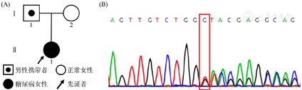 注:(A)患者家系图;(B)GCKR基因c.69delG突变Sanger测序验证结果;GCKR:葡萄糖激酶调节因子;红框所示为突变位点