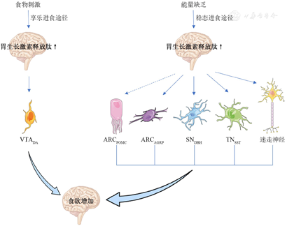 事实上,肥胖症最关键的致病因素是由于机体食欲旺盛而过度进食。进食除了能满足机体能量消耗的需要,还可以令人愉悦。由此可分为稳态进食(homeostatic feeding)和享乐进食(non-homeostatic feeding)。
