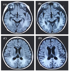 患者2,男,5岁,主诉为视物模糊5个月,肢体抽搐2个月。5个月前患者无明显诱因出现视物模糊,伴注意力不集中,伴纳差、恶心,就诊于当地医院,诊为"斜视",未治疗。2个月前患者发热后出现抽搐,发呆、反应迟钝、手眼不协调,头颅MRI见双侧额顶枕颞叶异常信号影,考虑X-ALD。ABCD1基因测序:c.887A>C(p.Y296S),诊断为CCALD。1个月前,行造血干细胞移植(haematopoietic stem cell transplantation,HSCT),术后病情进展,出现失语、吞咽困难,双下肢瘫痪。查体,血压108/69 mmHg,消瘦,周身皮肤发黑,双下肢肌力Ⅰ级。