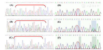 注:(A)患者1,c.910delins22(p.A304delins8); (B)患者1母亲(杂合突变); (C)患者1妹妹(杂合突变); (D)患者3,c.1451_1481del(p.P484fs); (E)患者3母亲(杂合突变); (F)患者3姨妈(有临床表现的杂合突变)
