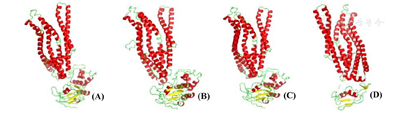注:ALDP:肾上腺脑白质营养不良蛋白;蛋白质链被显示为一个光滑的骨架,随机线圈以绿色显示,α螺旋显示为红色,β折叠显示为黄色箭;(A)ALDP野生型具有61%的α螺旋和7%的β折叠;(B)ALDP-p.A304delins8(突变型)具有64%的α螺旋和7%的β折叠;(C)ALDP-p.Y296S(突变型)具有61%的α螺旋和7%的β折叠;(D)ALDP-p.P484fs(突变型)具有69%的α螺旋和2%的β折叠