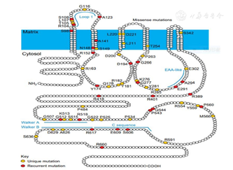 注:ALDP:肾上腺脑白质营养不良蛋白;TMD:跨膜结构域;NBD:核苷酸结合结构域;ALD:肾上腺脑白质营养不良;转运蛋白的3个关键区域在图中用蓝色标出;(1)含有保守氨基酸的第1环(Loop 1),在Loop 1区的TMD1的起始处有一个保守的氨基酸,它可能协助ALDP正确定位[9]; (2)在TMD(包含氨基酸94~386)的第4和第5α螺旋之间存在亲水的Glu-Ala-Ala(EAA-like)序列,该序列控制着ABC转运体中各种底物的运输[9]; (3)NBD(包含氨基酸474~700),由C序列分隔的Walker A(包含氨基酸507~520)和Walker B(包含氨基酸617~632),分别含有一个保守的精氨酸(ALD蛋白中的R518)和天冬氨酸(ALD蛋白中的D629),通过Mg2+结合ATP[9]; C序列可能通过(EAA-like)序列介导与TMD的相互作用[12];错义突变(在56%的ALD病例中发生)用黄色表示发生一次,红色表示反复发生,频率从2到8次不等