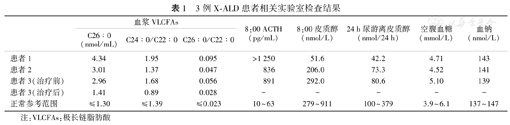血生化及影像学检查:3例患者FPG、血钠均正常,血浆VLCFAs、8:00 ACTH增加,8:00 COR及24 h UFC降低(表1)。