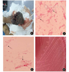患者男,54岁,农民,因"左足踝部肿痛、发紫6 h"入院。患者于48 h前赤足在淤泥地作业,12 h前开始出现左足踝部红肿,6 h前出现剧烈疼痛、发紫,呈持续性,伴左足感觉麻木,无明显发热,无畏寒寒战,无昏迷,无头痛,无呼吸困难,无腹痛、腹胀,无大小便失禁等。既往有2型糖尿病病史10年,血糖监测不规则,不规则服用药物治疗及注射胰岛素治疗;高血压病10年,不规则服用药物控制血压,血压监测不规则。体格检查:意识清楚,体温38.2 ℃,心率80次/min,呼吸20次/min,血压110/70 mmHg(1 mmHg=0.133 kPa);左足踝部肿胀明显,足趾、足踝部、小腿下段见皮肤发紫,大片水疱形成,伴恶臭,未及足背动脉搏动,足趾无明显血供,活动受限(图1)。实验室检查,血气分析pH 7.4,氧分压63.2 mmHg,二氧化碳分压34.2 mmHg,碳酸氢根20.9 mmol/L,全血乳酸2.8 mmol/L;白细胞计数17.4×109/L,中性粒细胞比例0.902,C反应蛋白(CRP)>200 mg/L,Hb 110 g/L,血小板计数246×109/L;红细胞沉降率131 mm/1h;降钙素原>100 μg/L;PT 16.3 s,D-二聚体8.6 mg/L;肌红蛋白584.1 μg/L,CK 585 U/L,脑钠肽405.3 ng/L,尿素氮12 mmol/L,肌酐168 μmol/L,葡萄糖11.1 mmol/L,ALT 16 U/L,AST 25 U/L,钾4.19 mmol/L,钠131.6 mmol/L,氯98.4 mmol/L;尿常规和粪常规基本正常;HIV抗体、病毒性肝炎抗体和梅毒螺旋体特异抗体均阴性。抽取血及渗出液作细菌培养及涂片检查,涂片检到革兰阳性芽孢杆菌(图2,图3)。入院诊断:左小腿、左足气性坏疽(芽孢杆菌);2型糖尿病;高血压病,行左小腿中上段截肢术,手术前后均予以奥硝唑0.5 g每12 h 1次静脉滴注,联合哌拉西林/他唑巴坦4.5 g每8 h 1次静脉滴注抗感染,甲泼尼龙40 mg静脉滴注抗炎及祛痰抑酸补液等治疗。24 h后渗出液厌氧培养出细菌经鉴定为败毒梭菌,同时血液培养也提示败毒梭菌,菌落有迁徙生长现象(图4)。1周后患者体温波动于36.6~37.7 ℃,生命体征稳定,左小腿残端无红肿、渗液,未拆线。实验室检查:白细胞计数10.9×109/L,中性粒细胞比例0.834;CRP 26 mg/L;降钙素原3.84 μg/L。患者病情稳定,创口无明显化脓等不适,抗感染治疗有效。遂转当地县医院继续哌拉西林/他唑巴坦治疗15 d,治愈出院。