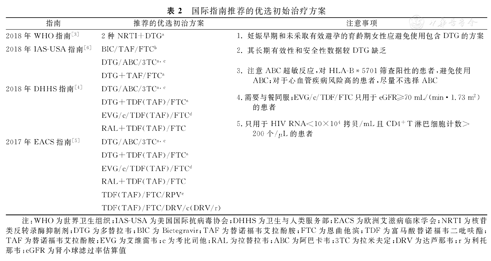 注:WHO为世界卫生组织;IAS-USA为美国国际抗病毒协会;DHHS为卫生与人类服务部;EACS为欧洲艾滋病临床学会;NRTI为核苷类反转录酶抑制剂;DTG为多替拉韦;BIC为Bictegravir;TAF为替诺福韦艾拉酚胺;FTC为恩曲他滨;TDF为富马酸替诺福韦二吡呋酯;TAF为替诺福韦艾拉酚胺;EVG为艾维雷韦;c为考比司他;RAL为拉替拉韦;ABC为阿巴卡韦;3TC为拉米夫定;DRV为达芦那韦;r为利托那韦;eGFR为肾小球滤过率估算值