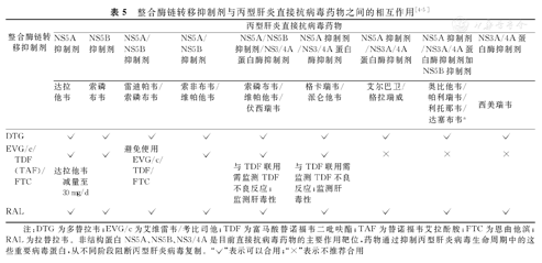 注:DTG为多替拉韦;EVG/c为艾维雷韦/考比司他;TDF为富马酸替诺福韦二吡呋酯;TAF为替诺福韦艾拉酚胺;FTC为恩曲他滨;RAL为拉替拉韦。非结构蛋白NS5A、NS5B、NS3/4A是目前直接抗病毒药物的主要作用靶位,药物通过抑制丙型肝炎病毒生命周期中的这些重要病毒蛋白,从不同阶段阻断丙型肝炎病毒复制。"√"表示可以合用;"×"表示不推荐合用