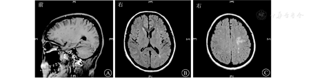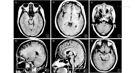 患者女,27岁,因"间断发热、头痛11个月,肢体麻木、纳差1 d"于2015年5月29日收治武汉市医疗救治中心。2014年5月患者因原发性不孕行体外受精-胚胎移植术,其后间断低热,8月下旬经超声检查提示死胎,即在外院行清宫术。9月下旬发热症状再次加重,在外院经抗感染治疗后一度好转。11月初患者再次出现发热,体温多在39 ℃左右,伴头痛、呕吐,经青霉素640万U,2次/d抗感染治疗后未见好转。反复在外院就诊,2014年11月9日行腰椎穿刺查脑脊液结果示白细胞计数55×106/L,乳酸脱氢酶35 U/L,总蛋白2 278 mg/L(表1);结核感染T淋巴细胞斑点试验阳性。11月10日行头颅MRI提示脑干、双侧小脑半球、双侧额叶及右侧颞叶异常强化灶(图1),诊断为结核性脑膜脑炎。彩色多普勒超声示子宫壁多发性钙化灶,子宫后壁囊性包块,考虑合并生殖系统结核。否认既往特殊病史。婚育史:患者20岁结婚,婚后7年内未避孕情况下未能正常受孕。予异烟肼0.4 g/d、利福平0.45 g/d、吡嗪酰胺1.25 g/d联合抗结核治疗后病情渐有好转,除吡嗪酰胺治疗5个月后停药外,其余药物持续应用于整个抗结核疗程中。2015年5月28日患者突发急性脑梗死,表现为吐词不清、左上肢乏力,遂入院治疗。6月2日复查头颅MRI见新发脑梗死病灶,但脑膜强化减轻(图2),6月5日查脑脊液相关指标好转(表1),加强抗结核治疗(异烟肼0.4 g/d、利福平0.6 g/d、吡嗪酰胺1.5 g/d、对氨基水杨酸钠8.0 g/d、阿米卡星0.6 g/d、左氧氟沙星0.6 g/d),辅以脱水、抗感染等治疗后好转出院。2015年7月19日患者突发运动性失语进行性加重,右侧肢体麻木,活动受限,伴有胸闷、气促,感疲乏无力,再次就诊,头颅MRI提示颅脑梗死病灶较前明显,但脑膜强化较前减轻(图3),2015年7月22日再次查脑脊液结果示总蛋白441.4 mg/L,白细胞计数、氯化物、葡萄糖等指标无异常(表1)。体格检查:神志清楚,反应稍迟钝;颈软,颈动脉搏动正常,双侧颈动脉未闻及血管杂音;双侧瞳孔等大等圆,对光反射灵敏,右眼外展不到边;伸舌右偏;右侧上肢肌力4+级,右下肢肌力4级,右侧Babinski征阳性,Kernig征阴性,右侧腱反射亢进,提示右侧肢体偏瘫。进一步行头颅磁共振血管成像(magnetic resonance angiography, MRA)示双侧大脑前、中动脉不显影、侧支循环增粗紊乱,Willis环特征性改变符合烟雾病(图4)。继续完善实验室检查,结核蛋白芯片检测38 000蛋白、脂阿拉伯甘露糖及结核分枝杆菌抗体-IgG均阳性,结核感染T淋巴细胞斑点试验阳性,抗核抗体谱2、抗中性粒细胞胞浆抗体、梅毒螺旋体抗体阴性;颈动脉彩色多普勒超声无异常;肿瘤标志物阴性;一次脑脊液抗酸染色阳性,因此排除其他感染、占位等因素,再次确认结核感染诊断,综合以上结果,诊断为结核性脑膜脑炎合并烟雾病。维持原方案抗结核治疗,并给予甘露醇稳定颅内压、地塞米松、吲哚布芬抗感染、营养神经、改善脑循环及防治血管性痴呆等治疗,患者脑梗死相关症状逐渐好转,肢体功能恢复,生活可以自理,而后出院继续服药治疗,治疗过程中定期复查腰椎穿刺脑脊液检查及头颅MRI检查等,抗结核治疗2年后复查头颅MRI提示脑膜强化等基本吸收(图5),抗结核治疗2年满疗程停药。