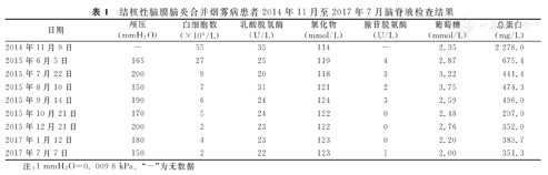 结核性脑膜脑炎合并烟雾病患者2014年11月至2017年7月脑脊液检查结果