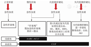 注:AARC-ACLF为亚太肝病学会慢加急性(亚急性)肝衰竭研究组定义的ACLF;CLIF为欧洲肝病研究协会慢性肝病研究中心定义的ACLF;HE为肝性脑病;HRS为肝肾综合征;AKI为急性肾损伤;ACLF为慢加急性(亚急性)肝衰竭