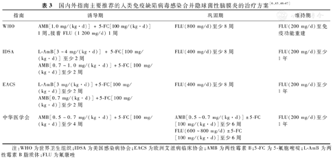 注:WHO为世界卫生组织;IDSA为美国感染病协会;EACS为欧洲艾滋病临床协会;AMB为两性霉素B;5-FC为5-氟胞嘧啶;L-AmB为两性霉素B脂质体;FLU为氟康唑