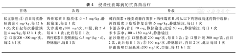 无菌部位组织标本镜检或培养出曲菌仍是侵袭性曲霉病诊断的金标准。对于无法获得确诊的患者,综合考虑其危险因素、症状、影像学检查表现后高度怀疑曲霉病者,可经验性抗曲菌治疗。对于有危险因素且GM试验阳性的患者,应抢先治疗。曲霉病的抗真菌治疗方案见表4。推荐尽早启动ART,不推荐对侵袭性曲霉病进行一级和二级预防。