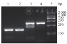 注:1为患者血样的扩增产物;2为恶性疟特异性的扩增产物;3为恶性疟和间日疟混合的扩增产物;4为间日疟的特异性扩增产物;5为标志物