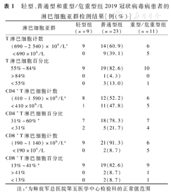 轻型、普通型和重型/危重型组2019冠状病毒病患者的淋巴细胞亚群检测结果[例(%)]