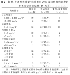 轻型、普通型和重型/危重型组2019冠状病毒病患者的相关炎症指标结果[例(%)]