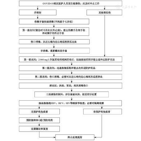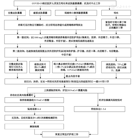 基于对COVID-19隔离病区OEID风险细致的理论分析、实例调查和现场推演,制订了《传染病职业暴露处理流程》(专院医202056号文件),其关键路线见图1和图2。