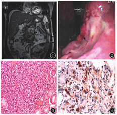 患者男,51岁,因"反复肝区不适12年,加重10 d"于2017年1月17日就诊于山东省泰安市解放军联勤保障部队第九六〇医院(原解放军第八十八医院)。2010年3月16日患者于解放军联勤保障部队第九六〇医院行肝穿刺活组织检查,病理检查结果示:CHB伴肝硬化形成(G2,S4),坚持口服恩替卡韦片(0.5 mg,1次/d)抗病毒治疗7年。患者10 d前无明显诱因下再次出现肝区不适,无食欲不振、乏力,无恶心、呕吐,无腹胀、腹痛。个人史及既往史无特殊。体格检查示:慢性肝病面容,可见肝掌,肝区轻度叩击痛,其他体格检查均未见阳性体征。实验室检查:白细胞计数为6.71×109/L,红细胞计数为6.03×1012/L,血红蛋白为178 g/L,血小板计数为220×109/L;血清HBsAg为阳性,抗-HBs为阴性,HBeAg为阴性,抗-HBe为阴性,抗-HBc为阳性,HBV DNA<5.00×102 IU/mL;ALT为86 U/L,AST为93 U/L,γ-GT为64 U/L,AFP轻度升高(52.56 μg/L)。肝脏超声检查显示:肝脏大小尚可,肝包膜不光滑,肝内光点明显增粗、回声增强,肝实质回声不均质,可见数个结节状高回声散在分布,门脉主干内径约为1.2 cm,提示肝硬化。肝脏MRI检查显示:肝右叶体积略增大,左叶略缩小,肝裂增宽,肝实质内未见异常信号,动态增强扫描肝实质内未见异常强化灶,未发现肝脏占位性病变(图1)。基于上述结果,考虑AFP升高为活动性肝炎所致。住院后经恩替卡韦片(口服,0.5 mg/d)抗病毒,抗乙型肝炎胎盘转移因子注射液(肌内注射,2 mg/d)调节免疫,复方甘草酸苷(静脉滴注,160 mg/d)、多烯磷脂酰胆碱(静脉滴注,10 mL/d)抗炎、保肝等综合治疗15 d后,肝区不适症状缓解,复查肝功能示转氨酶恢复正常,ALT为15 U/L,AST为17 U/L,但AFP水平进一步升高至83.78 μg/L。进一步完善检查,胃镜检查示:胃小弯侧可见3.0 cm×3.0 cm大小的凹陷溃疡,附黄白苔,周围黏膜隆起、充血,考虑胃体癌(图2)。胃活组织病理检查提示:胃体低分化腺癌(图3)。胃癌区免疫组织化学染色AFP呈阳性表达(图4)。随后患者行胃癌切除及周围淋巴结切除清扫术,术后给予2周期XE-LOX方案进行化学治疗,即予奥沙利铂130 mg(第1天)+卡培他滨1 000 mg,2次/d(第1~14天)。术后2周复查AFP水平恢复正常。随访3年余,肿瘤未再复发,AFP水平持续正常。