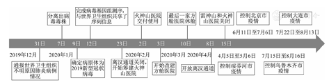 2019年12月31日,我国向WHO通报发现的不明原因肺炎病例情况,截至2020年1月22日24时,全国28个省(区、市)陆续出现了确诊病例,累计报告COVID-19确诊病例574例(含香港特别行政区、澳门特别行政区和台湾省各1例),其中重症95例,死亡17例(均来自湖北省),追踪到密切接触者5 897人[2],武汉市医疗机构出现有肺炎症状的患者人满为患和医疗资源挤兑现象。2020年1月23日10时,国家根据专家建议果断对武汉市采取关闭离汉通道措施,并开始建设火神山医院,2月2日火神山医院交付使用。2月3日后,又陆续建成16座方舱医院,总计开辟600多个集中隔离点。2月中旬之后,战"疫"进入新阶段。2月19日,我国新增确诊病例数降至千例以下。3月初,武汉市的疫情得到控制,单日新增确诊病例数逐步降至个位数,3月10日方舱医院休舱,4月8日武汉市开放离汉通道,4月15日火神山、雷神山医院关闭,至此武汉市共治愈47 283例COVID-19患者[3]。之后,我国黑龙江省绥芬河市、北京市、新疆维吾尔自治区乌鲁木齐市、辽宁省大连市等相继出现局部小规模疫情,均在约1个月内得到成功处置。见图1。与2003年的严重急性呼吸综合征(severe acute respiratory syndrome,SARS)疫情处置相比,此次响应速度有长足进步。
