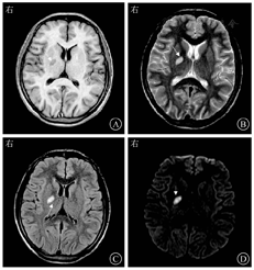 患者男,26岁。因"发热、头痛1个月"于2019年5月6日入南京中医药大学附属南京医院。患者1个月前在无明显诱因下出现全身乏力,伴发热,体温为38.0 ℃左右,无其他伴随症状,当地医院予以输液治疗(具体不详)后体温恢复正常,但出现头痛、恶心,无呕吐,后头痛呈持续性加重,休息后无好转。1 d前患者再次出现发热,体温为38.5 ℃,伴有畏寒、头痛,考虑"中枢神经系统感染",因其HIV抗体阳性,故转入南京中医药大学附属南京医院。患者1年前曾有梅毒病史,自诉于当地医院接受肌内注射苄星青霉素治疗3次后未再复查。患者于2016年确诊HIV-1抗体阳性,并启动拉米夫定+替诺福韦+奈韦拉平抗病毒治疗,1年前自行停止抗病毒治疗,CD4+T淋巴细胞计数和病毒载量均不详。既往有双性无保护冶游史。体格检查:体温为38.5 ℃,脉搏为70次/min,呼吸为20次/min,血压为120/80 mmHg(1 mmHg=0.133 kPa)。神清,精神萎,消瘦貌,言语正常,对答切题,查体合作,全身未见皮疹,皮肤、巩膜未见黄染,颈部淋巴结未触及明显肿大。双侧瞳孔等大、等圆,直径为3 mm,对光反射灵敏,口腔黏膜未见白斑。颈项强直,双肺呼吸音清,未闻及干、湿啰音,心音有力,律齐,未闻及病理性杂音。腹平软,无压痛,肝脾肋下未及,移动性浊音阴性。克尼格征和布鲁津斯基征均为阴性,右侧巴宾斯基征可疑阳性。入院后血液分析、生物化学检查、凝血功能检查均未见明显异常。血清快速血浆反应素试验(rapid plasma regain test,RPR试验)效价为1∶512,梅毒螺旋体明胶凝集试验(treponema pallidum particle assay,TPPA)阳性。单纯疱疹病毒Ⅰ型抗体IgG阳性,单纯疱疹病毒Ⅰ型抗体IgM和Ⅱ型抗体IgG+IgM均阴性;CMV DNA<500拷贝/mL。血MTB抗体、T-SPOT.TB、血隐球菌荚膜抗原、血GeneXpert MTB/RIF、血培养和血分枝杆菌培养均为阴性。CD4+T淋巴细胞计数为57/μL。头颅CT+胸部CT平扫检查未见明显异常;颅脑MRI检查示右侧基底节区有异常信号,感染可能(图1)。行腰椎穿刺术送检脑脊液显示:脑脊液压力为100 mmH2O(1 mmH2O=0.009 8 kPa),脑脊液常规检查显示无色、清晰;潘氏球蛋白试验阴性;有核细胞计数为116×106/L,多核细胞占35%,单核细胞占65%;脑脊液CMV DNA<500拷贝/mL;脑脊液墨汁染色、脑脊液结核分枝杆菌涂片、脑脊液隐球菌荚膜抗原、脑脊液GeneXpert MTB/RIF和脑脊液培养均为阴性;脑脊液梅毒抗体RPR试验阳性(效价为1∶2),TPPA阳性;宏基因组学第二代测序(以下简称二代测序)检测出密螺旋体序列52条,人类疱疹病毒5型(即CMV)序列14条。诊断为神经梅毒,予青霉素钠(每次320万U,每4 h 1次,静脉滴注)进行驱梅治疗,予甘露醇(25 g/次,每8 h 1次,静脉滴注)进行脱水降颅压治疗,予拉米夫定(0.3 g,1次/d)、替诺福韦(0.3 g,1次/d)和洛匹那韦/利托那韦(每次400/100 mg,2次/d)进行抗反转录病毒治疗,患者发热、头痛症状逐渐消退。采用青霉素治疗10 d后,患者再次出现发热,并出现皮疹伴瘙痒,怀疑青霉素过敏反应,改用头孢曲松(每次1.0 g,每12 h 1次,静脉滴注)进行驱梅治疗。完成14 d驱梅治疗疗程后,患者症状逐渐缓解,予以办理出院,随后失访。