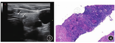 患者女,38岁,因"体格检查发现双肺多发占位3 d"于2019年10月21日入院。患者无咳嗽、咳痰、发热、盗汗等症状,体格检查示:甲状腺无肿大、压痛;全身浅表淋巴结未触及;呼吸运动正常,双肺呼吸音清,无干湿性啰音。入院后完善相关检查。超声检查示:甲状腺双侧叶实性结节[甲状腺影像报告和数据系统(throid imaging reporting and data system,TIRADS)分级为4a级,建议行超声引导下细针吸取(fine-needle aspiration)],甲状腺右侧叶囊实性结节(TIRADS分级为3级),见图1。胸部CT检查示:甲状腺双叶低密度结节,双肺多发结节,见图2。PET-CT检查示:双肺多发结节代谢较活跃,甲状腺双叶多发低密度结节代谢活跃。T-SPOT.TB示抗原A[早期分泌抗原靶-6(early secretory antigenic target-6,ESAT-6)]孔斑点数为56个,抗原B[培养滤液蛋白10(culture filtrate protein 10,CFP-10)]孔斑点数为50个;抗酸染色未见抗酸杆菌;血清三碘甲腺原氨酸(triiodothyronine,T3)、甲状腺素(thyroxine,T4)、游离三碘甲腺原氨酸(free triiodothyronine,FT3)、游离甲状腺素(free thyroxine, FT4)、促甲状腺激素(thyroid-stimulating hormone,TSH)均正常,结核特异性分泌抗原抗体、结核分枝杆菌抗体IgM及IgG均为阴性。行超声引导下甲状腺结节穿刺细针吸取细胞学检查(图3),在多普勒超声引导下以22 G穿刺针进入结节,反复提拉,快速对结节抽吸约10~15次,并旋转针尖,取病灶的不同部位,抽出物以液基固定送病理检查。采用无菌棉球覆盖穿刺部位,按压5~10 min以防出血。病理检查显示:甲状腺右叶下极肉芽肿性炎伴坏死,结核不除外,见图4;甲状腺左叶下极考虑结节性甲状腺肿;肺穿刺活组织病理检查示肉芽肿性炎伴坏死,倾向结核,见图5。结合临床病史,以及实验室、影像学检查,基本可以诊断为肺结核合并甲状腺结核。