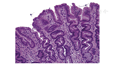 胆汁反流性胃病的组织学表现有以下特点(图3)。①胃小凹上皮的增生,胃小凹变长、扭曲,呈"开塞钻"样改变;②胃上皮细胞再生的改变,表现为上皮细胞呈立方形、核大,缺乏黏液,有时这些改变会与异型增生相混淆;③胃黏膜固有层平滑肌纤维增生、血管充血;④急、慢性炎性细胞浸润不明显;⑤病变主要局限在胃窦或吻合口附近。