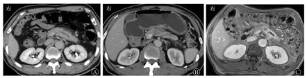 文献报道MSCT检测胰腺癌的敏感度可达90%以上[5,6]。胰腺癌通常在CT图像上表现为边界不清的实性肿块,相对正常胰腺实质略微低密度。胰腺癌合并急性胰腺炎的直接征象是胰腺轮廓扭曲,异常增多的软组织肿块突出于胰腺轮廓外,侵入相邻器官和(或)血管结构,增强呈轻度强化(图1A、图1B);如果同时发现淋巴结肿大或肝转移,则可以确立诊断。