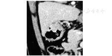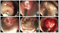 患者女,59岁,因上腹部烧灼感3年余、加重1年于2016年3月1日入院。2013年3月6日的胃镜检查显示慢性浅表性胃炎。2015年7月23日的胃镜检查显示胃体下段前壁有隆起性病变,大小约2.0 cm×2.0 cm,中央溃疡大小约0.5 cm×0.5 cm;病理检查显示慢性重度浅表活动性炎。2016年1月28日的胃镜检查显示胃体、胃窦交界处有隆起性病变,大小约2.5 cm×3.0 cm,中央浅凹溃疡灶大小约0.5 cm×0.6 cm;病理检查显示慢性中度浅表活动性炎。2016年2月18日的CT检查显示胃壁增厚,胃体小弯侧占位(间质瘤不除外),未见肿大淋巴结,见图1。入院后体格检查:体温为36.5 ℃,脉搏为78次/min,血压为130/85 mmHg (1 mmHg=0.133 kPa),一般情况可,未发现明显异常体征。胃镜检查显示胃体下部前壁有2.5 cm×3.0 cm大小的隆起性病变,中央溃疡大小约0.5 cm×0.6 cm,见图2A。超声内镜检查显示病灶处为低回声团块,内部回声欠均匀,起源于固有肌层,向腔外突出,怀疑胃间质瘤,见图2B。患者CEA、CA19-9、CA125等实验室指标均未见异常。排除相关禁忌证后,在全身麻醉下行内镜黏膜下剥离术(endoscopic submucosal dissection,ESD)。病灶周围在黏膜下注射靛胭脂,抬举征阴性;予Dual刀标记并环周切开,见图3A和图3B;继续予Dual刀及末端绝缘刀剥离黏膜及黏膜下病灶,见图3C和图3D;创面予热活检钳电凝止血,术后创面无活动性出血,病灶剥离完整,见图3E和图3F。术后病理显示,黏膜下见一大小约2.2 cm×1.5 cm×1.0 cm的病灶,边界清晰,见图4A;增生的淋巴组织间见散在成巢排列的异型细胞,伴反应性淋巴滤泡形成,见图4B。免疫组织化学检查显示,细胞角蛋白(cytokeratin,CK)5/CK6均阳性,见图5A;P40蛋白质阳性,见图5B;P63阳性;Ki-67为30%;CK7、CK20、CD20、CD3、CD5、CD56、突触素、嗜铬素A、CD34、CD31、CD23和CD21均阴性。原位杂交证实EB病毒感染存在,见图5C。病理诊断为胃淋巴上皮瘤样癌(lymphoepithelioma-like carcinoma,LELC)。与患者充分沟通,行鼻咽镜和全身正电子发射计算机断层显像(positron emission computed tomography, PET)/CT检查排除转移性癌后,接受腔镜下远端胃大部切除术并淋巴结清扫,术后病理示原肿块已切除,符合术后改变,周围未见癌残留,两切端未见癌累及,淋巴结未见癌转移(0/17)。至截稿,患者仍在随访中。