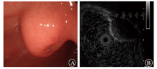 EB病毒阳性的胃LELC好发于男性,主要部位为近端胃,如胃贲门部、胃底、胃体;EB病毒阴性者相对发病年龄较大,好发于女性,且更常见于胃窦[6,9]。本例EB病毒阳性的胃LELC患者为女性,病变位于胃体、胃窦交界处,临床罕见。肿瘤虽起源于胃黏膜上皮,但可向黏膜下浸润,呈巢状、片状稀疏散在于密集浸润的淋巴组织中,加之表面黏膜可完整覆盖,常表现为黏膜下隆起性病变,传统经胃镜活组织检查的准确率较低。超声内镜可帮助判断肿瘤的边界、大小、部位等,但仍难以与胃肠道间质瘤、淋巴瘤等黏膜下肿瘤相鉴别[12]。本病例成功进行了一次性完整剥离病变,术后病理明确胃LELC的诊断,提示ESD对黏膜下肿瘤的诊断价值。此外,追加外科手术后的病理结果令人满意,基于该病相对较低的淋巴结转移率和较好的预后,ESD及随后的保守治疗可作为早期胃LELC尤其是伴有严重并发症及较高手术风险患者的可选治疗方案之一。