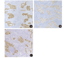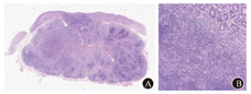 Grogg等[8]认为胃LELC的发生与EB病毒感染或高频微卫星不稳定性(microsatellite instability-high,MSI-H)有关,报道的110例中无一例同时出现EB病毒阳性和MSI-H的情况,提示EB病毒和MSI-H是参与胃癌发生不同病原学路径的互不相关的致病因素。Min等[9]研究显示超过80%的胃LELC为EB病毒阳性,而EB病毒阴性的胃LELC中MSI-H仅占25%,其发病机制仍有待进一步研究。胃LELC预后较其他传统类型胃癌好,包括非LELC的EB病毒阳性胃癌,5年生存率达83%[10,11]。一些学者认为其较好的预后与机体的淋巴反应有关,大量淋巴组织的浸润不利于肿瘤穿透胃壁、淋巴结转移和淋巴结扩散[12]。有研究显示,EB病毒阳性是有利于胃LELC患者预后的独立因素,而MSI-H则与EB病毒阴性患者预后无明显相关性[9]。但也有学者认为患者预后与EB病毒阳性率及微卫星不稳定性状态无关[8]。