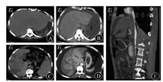 典型CT表现包括[24,25,26,49,50,51]:①肝脏弥漫性肿大,平扫显示肝实质密度不均匀减低;②静脉期和平衡期肝实质呈特征性"地图状""花斑样"不均匀强化,门静脉周围出现的低密度水肿带称为"晕征";③尾状叶、肝左外叶受累稍轻,肝静脉周围肝实质强化程度较高,呈现特征性"三叶草征",肝静脉管腔狭窄或显示不清,下腔静脉肝段受压变细;④通常合并腹水、胸腔积液、胆囊壁水肿和胃肠壁水肿等肝外征象(图3)。急性期患者较少合并脾大、食管胃静脉曲张等征象。