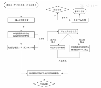 注:PA为吡咯生物碱;CT为计算机断层扫描;MRI为磁共振成像;PPAs为吡咯蛋白加合物;HVPG为肝静脉压力梯度;PA-HSOS为吡咯生物碱相关肝窦阻塞综合征