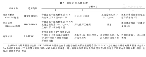 | 改良西雅图(Seattle)标准 | HSCT-HSOS | 骨髓造血干细胞移植后20 d内出现以下3项中的2项 | 肝大、肝区疼痛 | 血清总胆红素≥34.2 μmol/L | 腹水或体质量增加超过原体质量的2% |