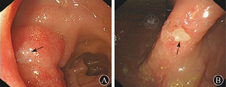 黄志清和丁兆祥[10]报道了1例75岁因胆囊腺癌形成CCF而引起消化道出血的女性患者,通过剖腹探查发现了瘘管。张澜和王康[11]描述了1例52岁右上腹痛、解鲜红色血便的男性患者,急诊手术发现胆囊与结肠肝曲形成内瘘,瘘口不断有鲜血流出,胆囊内壁可见一动脉出血。田夫等[12]报道了1例62岁突发便血的男性患者,剖腹探查发现CCF,内瘘继发炎性肉芽肿引起下消化道出血。Xie等[13]分析了1例反复鲜血便和腹痛的45岁男性患者,腹部增强CT检查和肝脏血管造影显示胆囊积气,造影剂异常蓄积于肝右动脉,造影剂通过瘘管进入结肠,CCF因此得以发现。周立强等[14]报道了1例54岁因间断血便入院的男性患者,剖腹探查术中发现胆囊壁增厚,胆囊内大量血凝块,胆囊与结肠紧密相连,形成CCF。