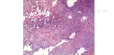入院第2天,患者突然解黑便,量约500 mL,立即给予PPI抑酸、静脉注射尖吻蝮蛇血凝酶(商品名为苏灵)止血等治疗,行急诊胃镜检查,发现胃角和十二指肠球部溃疡(图3)。急查血常规示血红蛋白为118 g/L,故考虑消化性溃疡引起黑便可能性大,遂继续给予PPI、尖吻蝮蛇血凝酶等治疗,密切关注病情变化。入院第3天,患者出现鲜红色血便,量约2 000 mL,伴头晕、心慌,无腹痛,血压为86/60 mmHg,由于大量鲜血便,考虑为下消化道出血,立即在积极抗休克、PPI抑酸、输血、心电监护下行急诊肠镜检查,由于肠腔大量积血,影响视野,未发现出血点。遂又进行腹腔血管造影检查,发现右侧肝动脉分支造影剂蓄积,考虑假性动脉瘤,除此之外未发现造影剂流入肠道,见图4。经过全院会诊,考虑患者存在胆囊结石、胆囊炎等基础疾病,现出血原因不明,经积极保守治疗仍未控制出血,有外科手术指征,遂于11月21日行剖腹探查术,术中探查胃、小肠未见明显异常,胆囊壁增厚,并与结肠紧密相连,胆囊周围大量瘢痕组织增生,切开胆囊,可见大量血凝块,清除血凝块可见胆囊床侧胆囊内壁血管搏动性出血,缝扎胆囊内壁出血动脉,继续探查见胆囊与结肠肝曲形成内瘘,血液经瘘口流入肠腔,仔细分离胆囊结肠瘘(cholecystocolonic fistula, CCF)壁,常规切除胆囊,用可吸收线间断缝合关闭结肠瘘口,在距盲肠约25 cm末端回肠处行回肠双腔造口,腹膜、腹外斜肌腱膜、皮肤分别与肠管和肠系膜固定,0.9%氯化钠溶液清洗腹腔,放置引流管,清点器械、纱布无误后,关闭腹腔。术后病理诊断为CCF或慢性胆囊炎伴急性发作(图5)。患者术后恢复良好,随访至截稿日期,患者再无消化道出血表现。