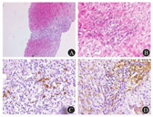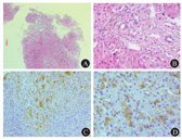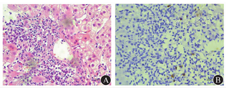 患者女,61岁,因食欲减退1年半于2016年7月6日入院。患者入院前1年半无明显诱因出现食欲减退,查ALT 267 U/L,AST 164 U/L,予硫普罗宁和还原型谷胱甘肽治疗,1个月后肝功能各指标水平降至正常。入院前10个月,患者出现双下肢及双侧眼睑水肿,查白蛋白20 g/L (正常值35~55 g/L),ALT 218 U/L,AST 233 U/L,ALP 216 U/L,GGT 35 U/L,TBil 6.3 μmol/L,DBil 3.4 μmol/L,24 h尿蛋白定量420 mg(正常值<150 mg),免疫指标抗核抗体、抗平滑肌抗体、抗肝肾微粒体1抗体、抗线粒体抗体、抗线粒体抗体M2型、抗核膜糖蛋白210、抗可溶性酸性磷酸化蛋白100抗体、抗双链DNA抗体、抗Sm抗体均阴性;乙型肝炎5项指标和丙型肝炎抗体均阴性;甲状腺功能正常。诊断为肾功能不全和不明原因肝损伤,予中药治疗2个半月后,患者双下肢水肿及双侧眼睑水肿好转,肝功能各项指标及尿蛋白恢复正常。停用中药治疗6个月后,患者再次出现厌食和乏力症状。实验室检查显示肝功能异常。肝脏瞬时弹性成像示肝脏硬度为13.3 kPa (正常值<7.3 kPa)。腹部超声检查未见明显异常。肝活组织病理检查示以淋巴细胞及嗜酸性粒细胞为主,肝细胞凋亡,点灶状坏死,以中央静脉周围为著,肝细胞轻度水样变性,见图2A。不排除诊断为药物性肝病。予丁二磺酸腺苷蛋氨酸(商品名为思美泰)治疗4个月余,肝功能各指标稍好转,但未降至正常,为明确诊断就诊。入院后查血清IgG4 3.74 g/L。全身淋巴结超声检查示双侧颈部多发淋巴结Ⅰ至Ⅱ区肿大,双侧腋下多发淋巴结肿大,形态回声未见明显异常。双侧腹股沟区多发淋巴结,右侧部分轻度肿大,形态回声未见明显异常。将患者入院前肝活组织病理检查再次行免疫组织化学染色示IgG4阳性浆细胞约10/高倍镜视野,见图2B。磁共振胰胆管造影未见明显异常。因此,该患者符合IgG4-RD的诊断标准[1]。予泼尼松60 mg/d起始治疗并在12周内逐渐减量至5 mg/d,患者症状逐渐好转,肝功能各项指标和血清IgG4水平均恢复正常。然而,以泼尼松5 mg/d的剂量维持治疗4个月后,患者再次出现肝功能异常,血清IgG4水平再次升高(2.19 g/L),予泼尼松30 mg/d起始治疗,在12个月内逐渐减量至5 mg/d。经4个月随访,患者肝功能和血清IgG4水平持续正常。